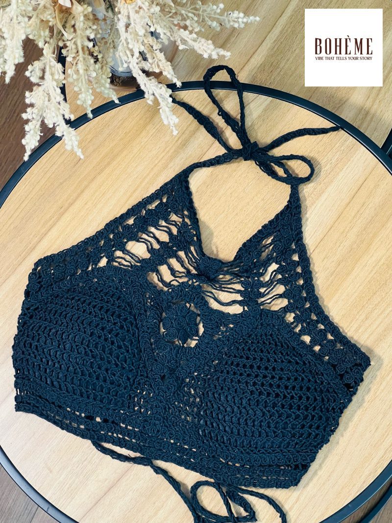 Black Boho Crochet Halter Top – Handmade Lace Bralette